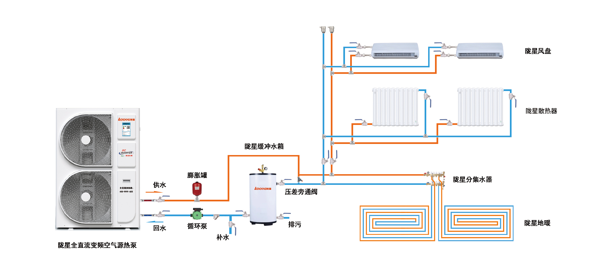 隴星將給客戶提供空氣能采暖“一站式六包服務”——包測量、包設計、包主材、包輔材、包施工、包售后,讓客戶真正做到省時、省心、省力、更省錢!